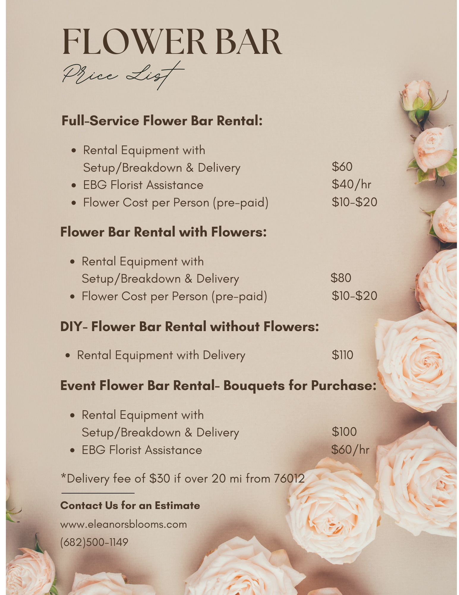 Rent the Flower Bar with or without flowers. Setup done by our team or DIY.