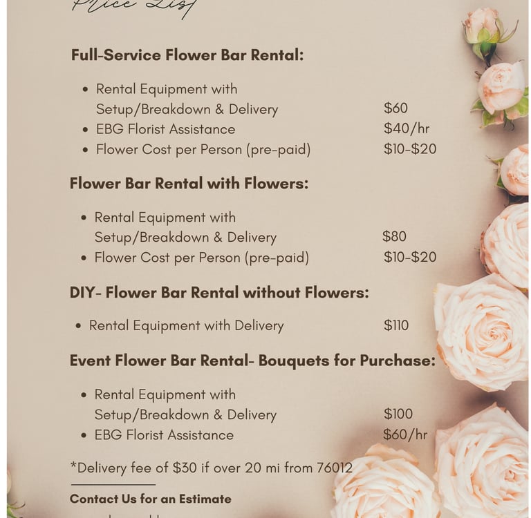 Sit back and relax while we deliver, setup, assists guests with arrangements, break down, clean up, and leave your event location as it was when we arrived. We will supply flowers, signage, flower bar, and all the trimmings.